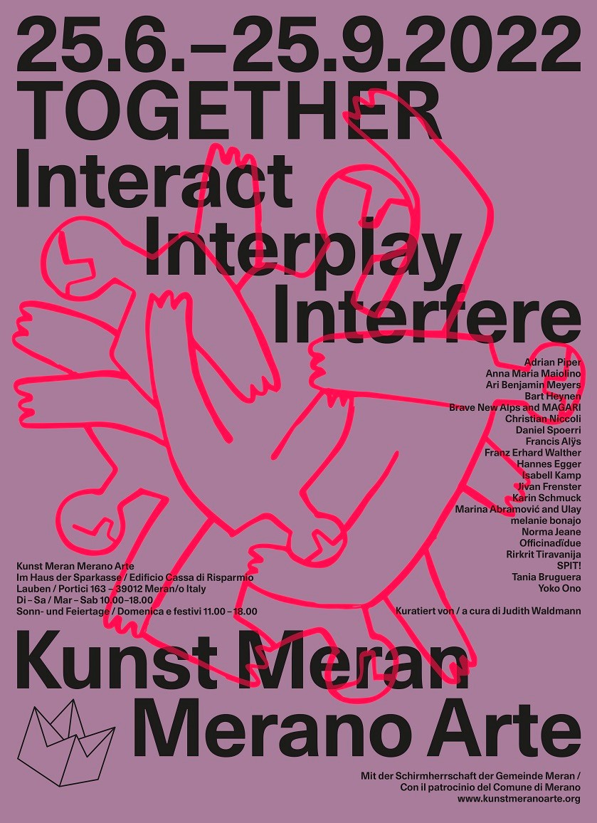 Künstler*innen: Adrian Piper, Anna Maria Maiolino, Ari Benjamin Meyers, Bart Heynen, Brave New Alps and MAGARI, Christian Niccoli, Daniel Spoerri, Francis Alÿs, Franz Erhard Walther, Hannes Egger, Isabell Kamp, Jivan Frenster, Karin Schmuck, Marina Abramović and Ulay, melanie bonajo, Norma Jeane, Officinadïdue, Rirkrit Tiravanija, SPIT!, Tania Bruguera, Yoko Ono