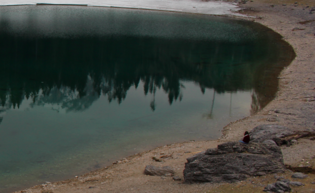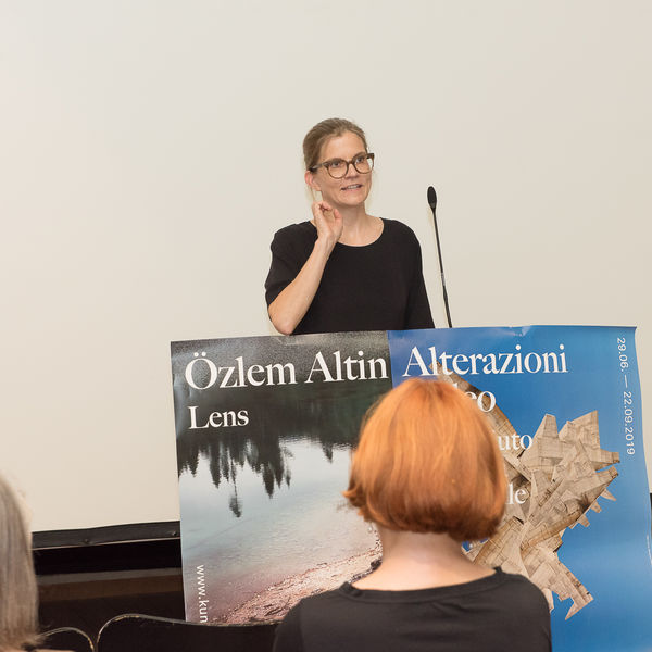 Inspiriert von dieser Geschichte inszeniert Özlem Altin im ersten Stock des Kunsthauses Meran eine atmosphärische Abfolge von Bildern: Zeichnungen, Malereien und Fotografien, die sie unter anderem in Meran geschaffen hat. Dabei untersucht sie das urmenschliche Bedürfnis, die umgebende Realität zu erklären und ihr – auch mithilfe von Geschichten und Sagen – einen Sinn zu geben. Der (Karer-)See dient der Künstlerin als Metapher für die durchlässige Grenze zwischen Realität und Imagination, zwischen Aussenwelt und Psyche. Die Wasseroberfläche versteht sie dabei wie eine Membran – eine „Linse“ –, die Einblicke in die andere Welt gewährt oder diese spiegelt.