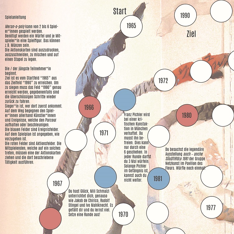 Zum Internationalen Museumstag am Sonntag, 16. Mai 2021, wird Meran-o-poly präsentiert. Der Künstler und Vermittler Hannes Egger hat es zur Ausstellung „Kultur in Bewegung – Meran 1965-1990“ entwickelt. Dabei nehmen die Spielenden die Rolle einer/eines Kunstschaffenden ein und spielen sich durch die Meraner Kulturszene der Jahre zwischen 1965 und 1990.