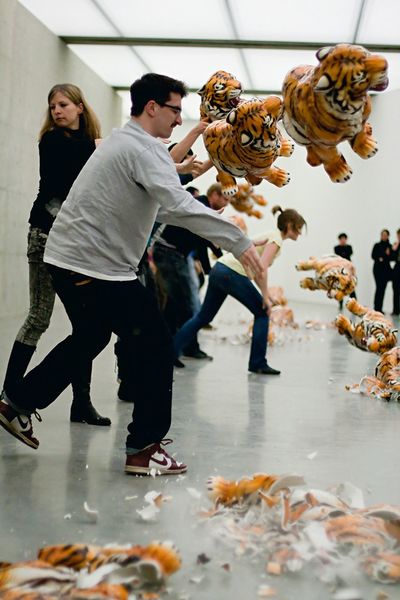 Das Foto wurde während einer Performance gemacht, die Maloberti 2010 für die Generali Foundation in Wien konzipiert hat. Die Tiger aus Keramik wurden in der Performance in einer Art Choreographie aufgestellt und von der Gruppe Menschen hochgehoben und so lange gehalten, bis die Kraft der Träger nachließ und sie die Tiere zu Boden warfen.
