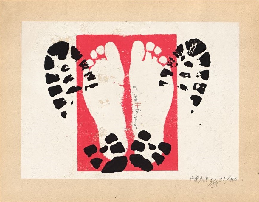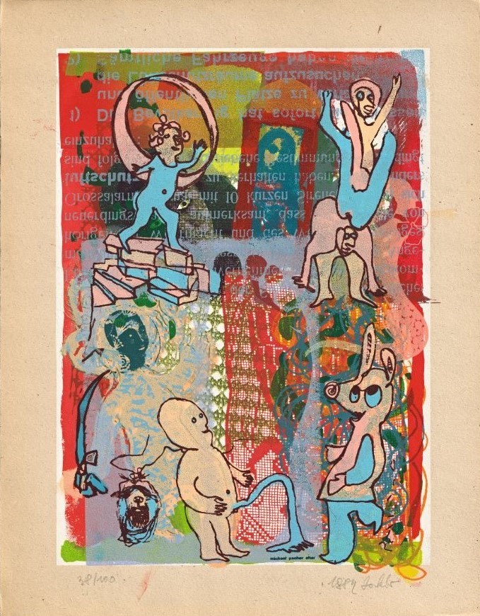 "Innerhalb der kulturellen Entwicklungen in Südtirol werden die drei in Meran sehr präsenten Künstler Franz Pichler (*1939, Schenna), Jakob de Chirico (*1943, Innsbruck), Matthias Schönweger (*1949, Tscherms) oft als Triumvirat wahrgenommen.78 Das stimmt zum Teil, etwa beim Bemühen, den Alltag, Italienisch und Deutsch, offen und lebendig zu gestalten und möglichst wenig Trennungslinien durch die Gesellschaft zuzulassen. Alle drei fokussieren im Bereich der Schule auf ein möglichst offenes pädagogisches Herangehen. Sodann war für alle drei die Druckerpresse von Jakob de Chirico, vor allem für den praktischen und vielfältigen Einsatz des Siebdrucks, ein neuralgisches, einfach technisch notwendiges Scharnier. (…) 1984 publizieren die drei zusammen mit Luigi Serravalli eine programmatische Mappe mit je einem Siebdruck."